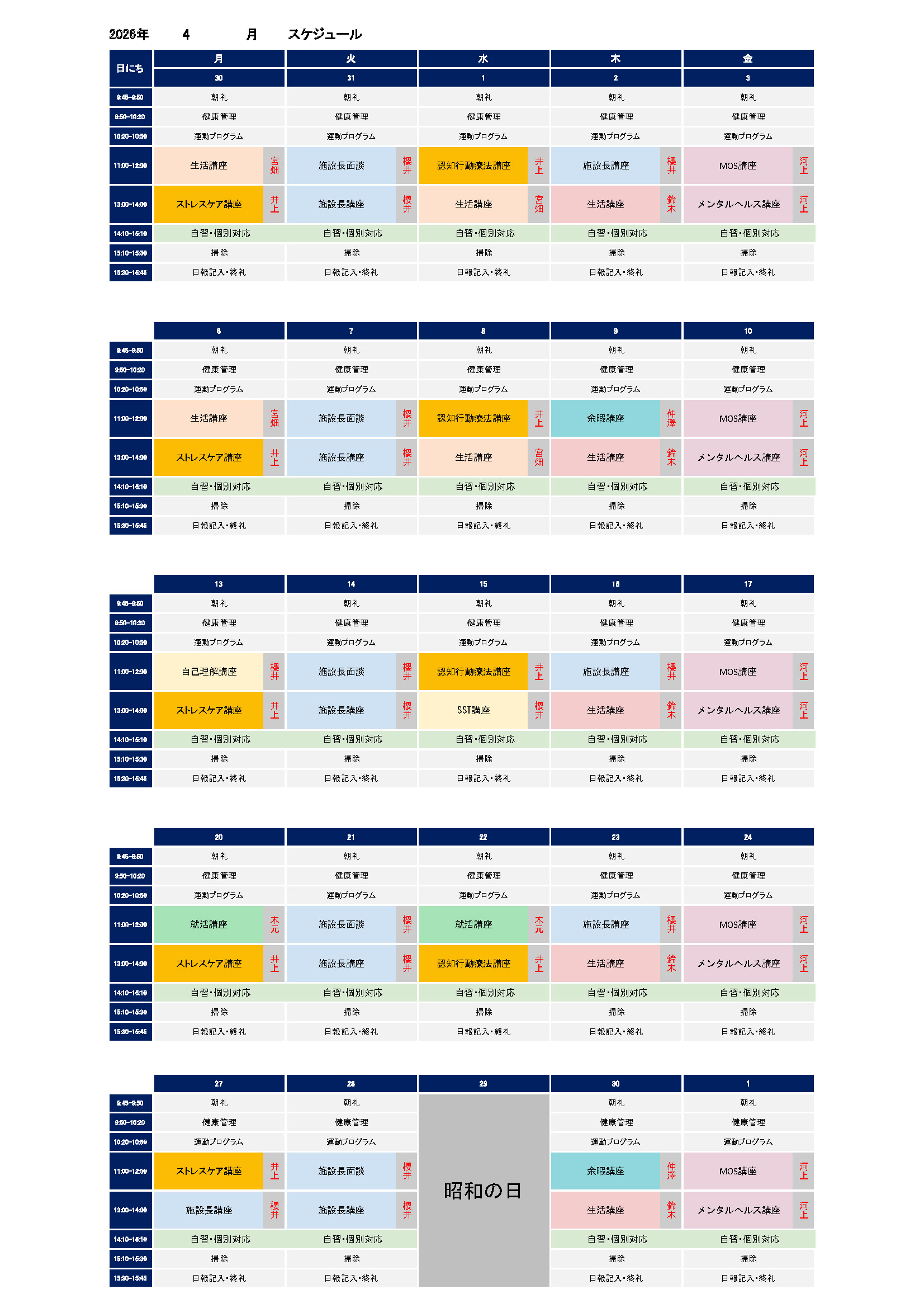 2026年4月の講座スケジュールが出来ました。