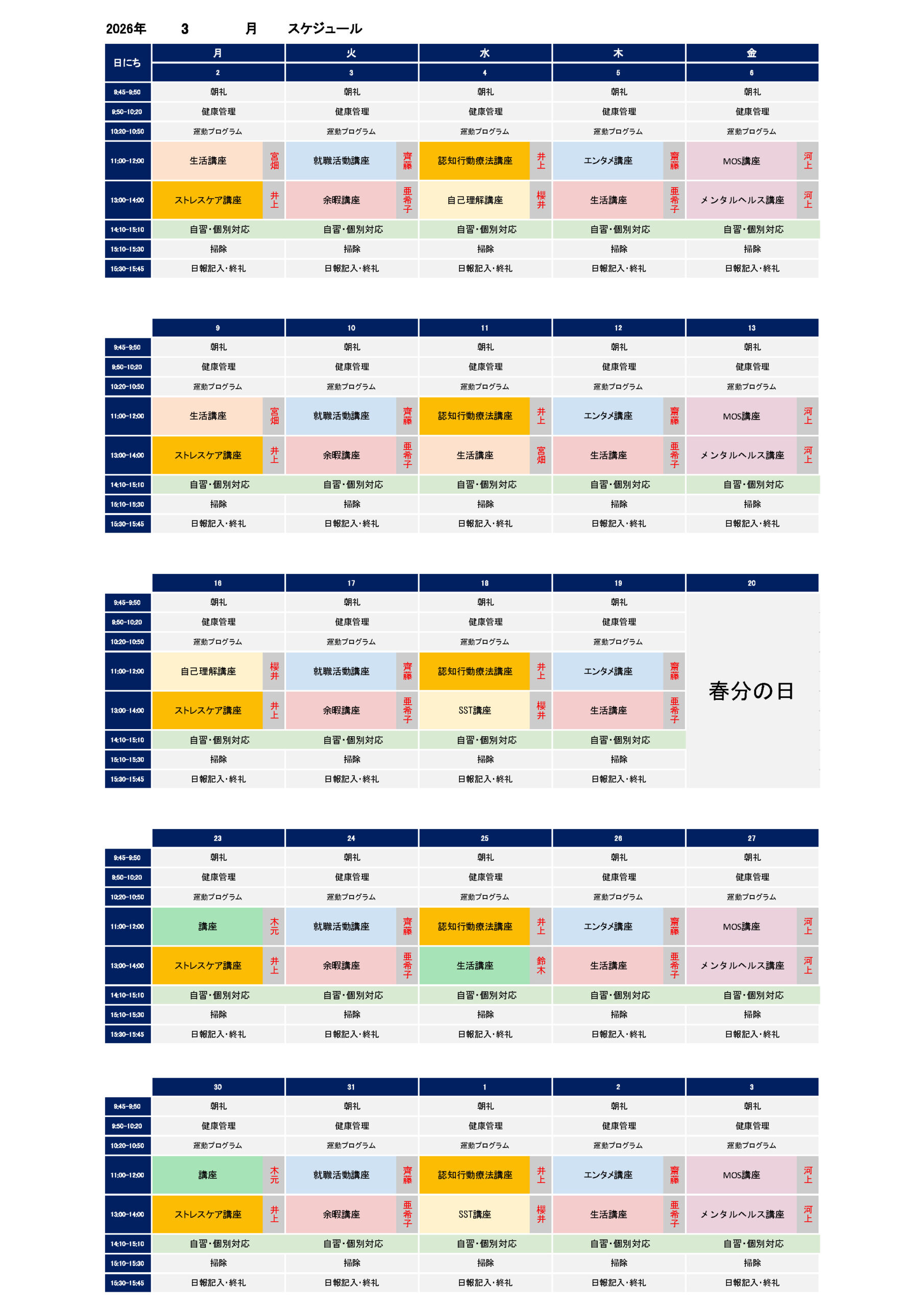 2026年3月の講座スケジュールが出来ました。