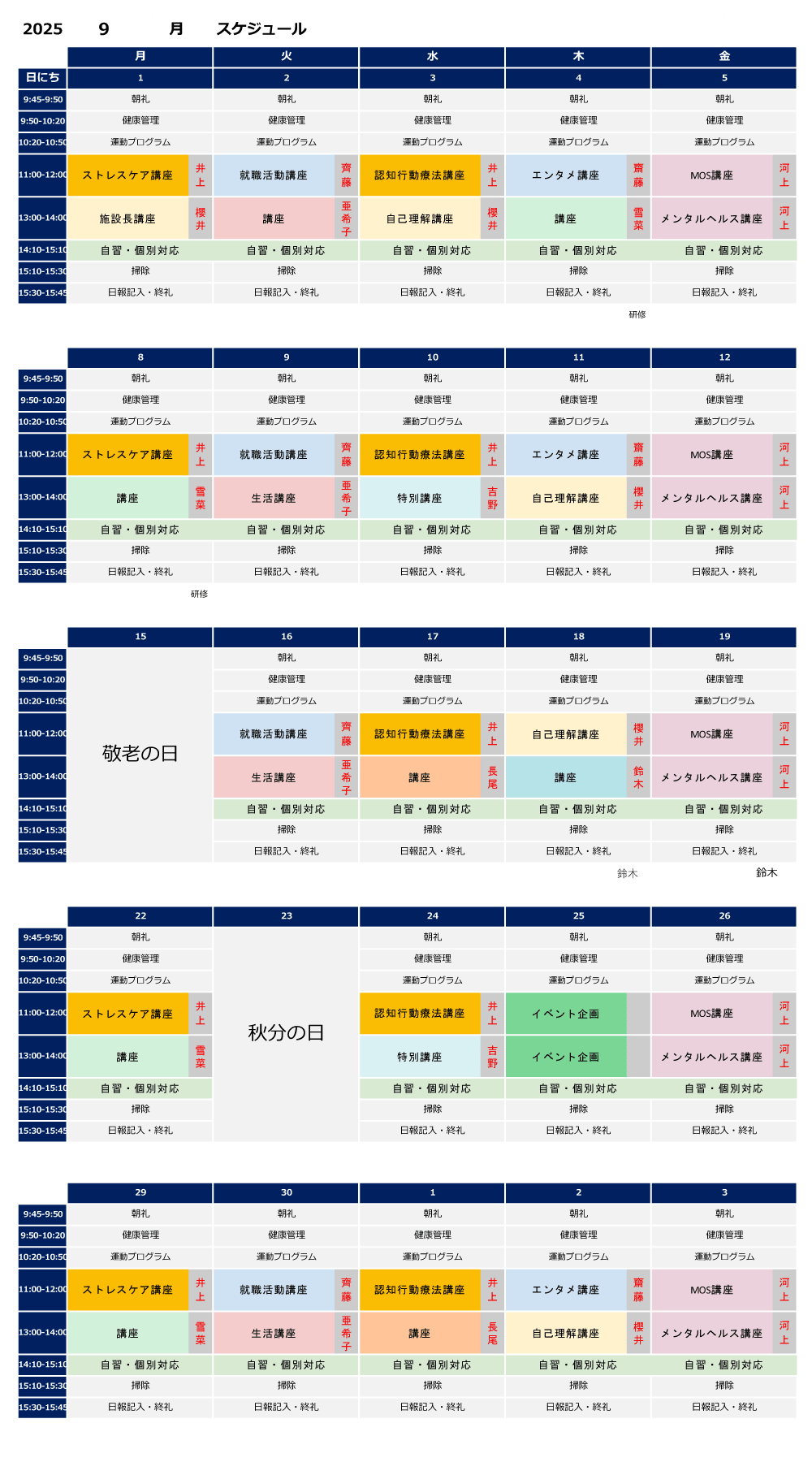9月の講座スケジュール